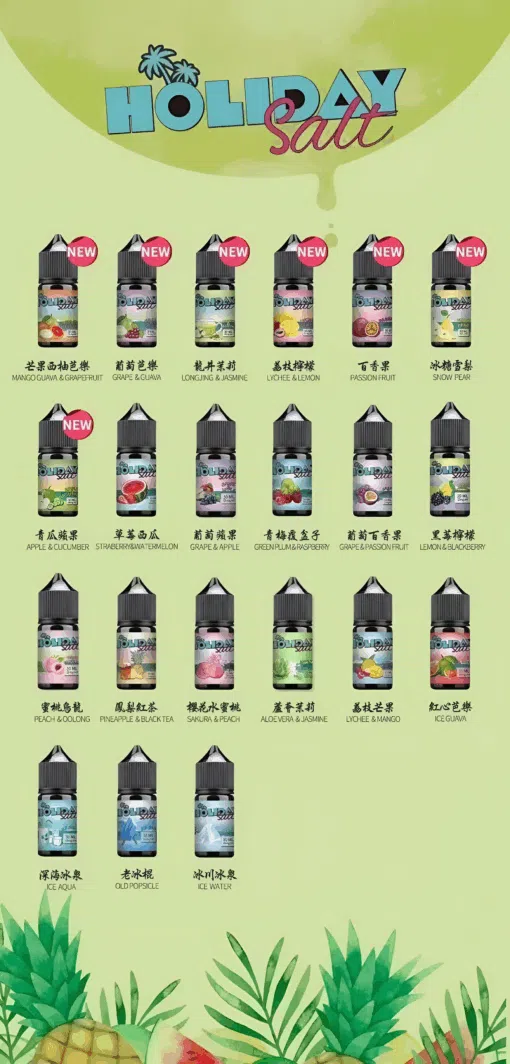 HOLIDAY SALT 假日鹽煙油是一款來自馬來西亞或東南亞,於台灣市場極受歡迎的 30 ml/35 mg 鹽基小煙油。它以「快速解癮+多口味+層次清新」備受推崇,無論是新手入門還是老玩家口糧,都有合適口味可以選。